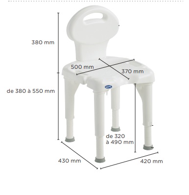 Chaise de douche réglable en hauteur de 38 à 55cm avec dossier amovible et démontable sans outils.