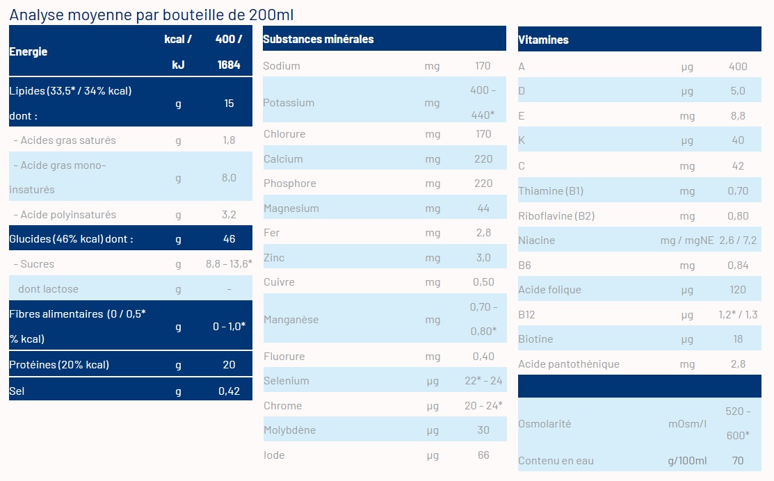 -400 kcal (2 kcal/mL) et 20g de protéines / flacon de 200mL