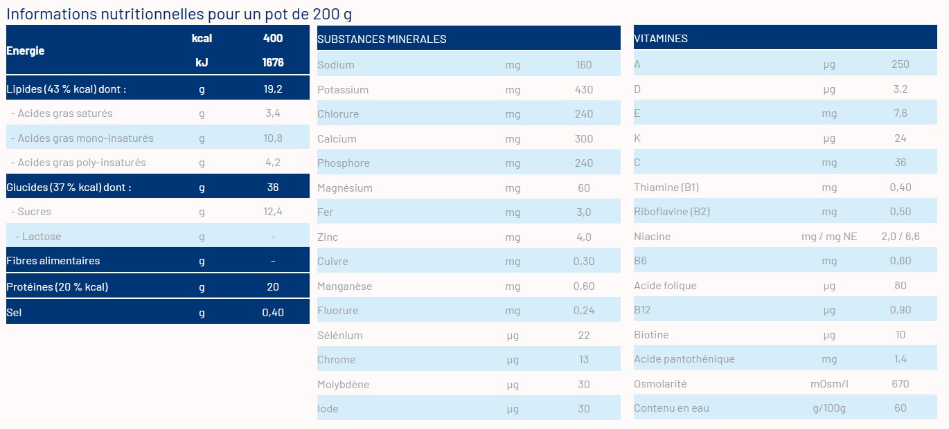 -400 kcal (2 kcal/mL) et 20g de protéines / cup de 200mL