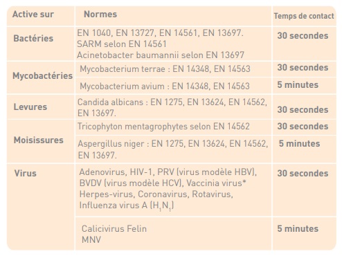 Pour la désinfection des surfaces et des dispositifs médicaux préalablement nettoyés non immergeables et non invasifs.